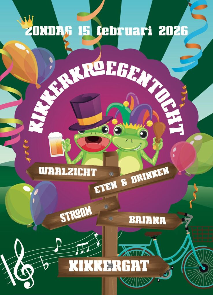 Op zondag 15 februari doen wij weer mee aan de legendarische Kikkerkroegentocht! Het gefeest en gehos start om 15:11 uur bij café Waalzicht, om 16:11 uur kom je langs bij café Eten en drinken, om 17:11 bij café Stroom en de avond wordt afgesloten vanaf 18:31 af bij Baiana. Doe ook mee en ga op de fiets van kroeg tot kroeg. Haal je early bird ticket alvast voor €5,11 via deze link. Dan zien we je 15 februari graag in je mooiste of gekste outfit langskomen!
