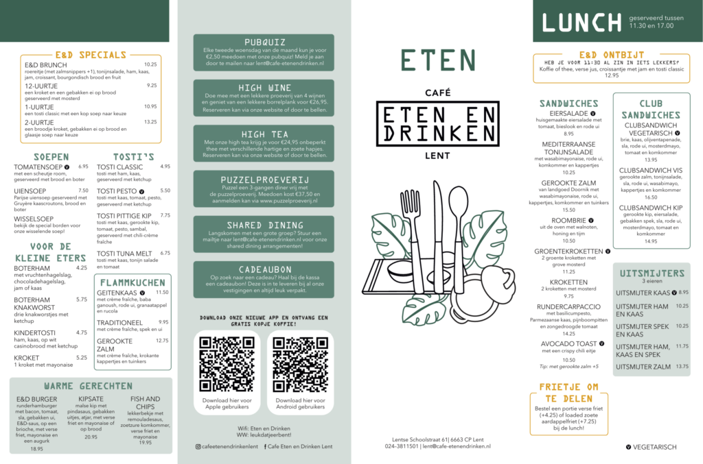 Je vindt Café Eten en Drinken Lent aan de Lentse Schoolstraat 61, net buiten de stad. Eind 2017 werd dit het tweede Eten en Drinken café dat Michiel Houkes en Chau Nguyen samen openden. Een fijne plek waar de rust van het dorp samenkomt met de gezelligheid van een levendig café. Met een bushalte om de hoek, gratis parkeergelegenheid en een ruime fietsenstalling zijn we voor iedereen makkelijk bereikbaar.