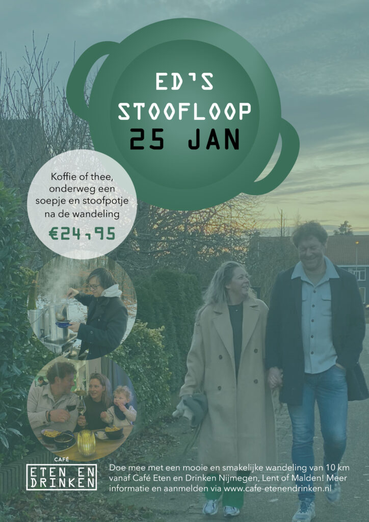 ED’s Stoofloop is een gezellige start van je Vierdaagse training! De wandeling is niet alleen de perfecte afstand om mee te beginnen (10 km) maar ik heel leuk om samen te lopen met vrienden. Met wat lekkers vooraf, tussendoor en achteraf houden we je warm in de winterse temperaturen. Begin de Vierdaagse voorbereidingen met een gezellig uitje bij café Eten en Drinken!