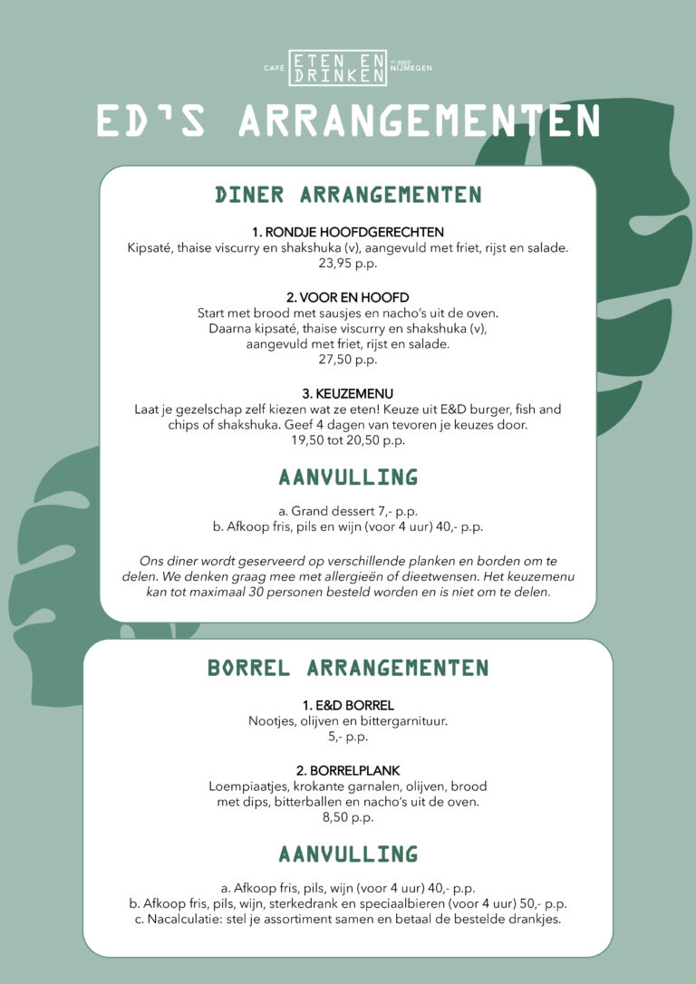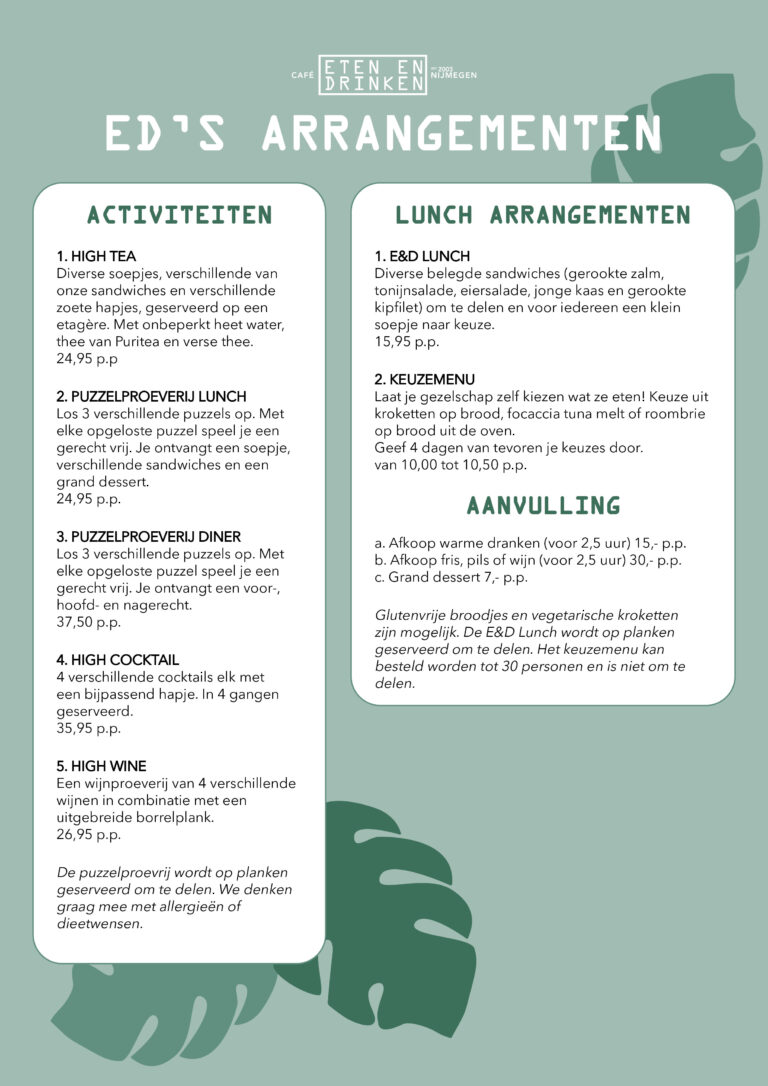 Bekijk hieronder onze arrangementen en prijzen! Natuurlijk kan er altijd overlegd worden om dingen weg te halen of toe te voegen, dus geef je wensen vooral door.